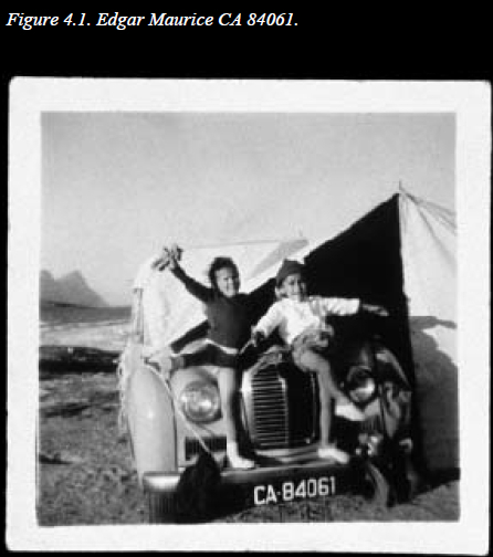 This photograph (Figure 4) taken in 1956 at a popular camping site in Kommetjie by Edgar Maurice, depicts his children seated on the bonnet of their family car parked alongside their canvas tent. The photograph is followed by another camping picture (Figure 4.1) captioned 'Edgar Maurice CA 84061'. In Figure 4.1, the mother, father and youngest sibling are included in the photograph. The narrative beneath these photographs inform us that the Maurice family took camping very seriously and continued these family outings even after their eviction from their family home, under the Group Areas Act of 1964.