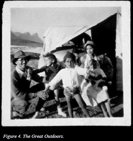 It is no coincidence that the technology of the hand-held camera contributes to the 'adventurous' and 'exploratory' spirit of the parents. As a result of the booming photographic mass market, the means for self-representation became available to many black families in South Africa during the 1900s.41Personal photographs became defined by these markets as amateur, and are meant to illustrate exciting holidays, days at the beach and happy family events (such as christenings, birthdays and weddings).42 Despite the ideology of home as the heart of the family, most personal pictures are in fact, of time spent away from the home. This coincides with the increased mobility and social status of families. The inclusion of the family car and canvas tent in Figures 4 and 4.1 is indicative of this shift.