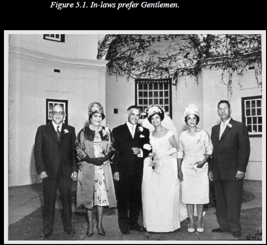 Figures 5 and 5.1, are exhibited under the theme 'Love and Marriage' with Figure 5.1 captioned, 'In-laws Prefer Gentleman'.46 These photographs were taken in 1962, in Rondebosch, Cape Town. The narration tells the story of Lionel Smith who returns to Cape Town after World War 2, where he was an officer in the English army. He marries Anne Fisher, formerly from "the Frenchmans of Walmer Estate" in what appears to be a lavish affair. The photographs are of a high quality, they are well-composed and aesthetically pleasing. Bur it is not clear whether the curator had them copied from the originals or whether they may in fact be the original copies (like many of the other photographs in the exhibition).