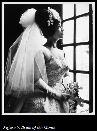 At this time, Figure 5 was entered into the "Bride of the Month competition in the Cape Times".47The narration is punctuated by phrases such as, "picture of the eligible bachelor", "big catch for any young woman", and "civilised gentleman who spoke the Queen's English". The curator provides the context, gathered from the owners of the photographs, to the photographs in the explanatory text beneath the captions. In so doing he reveals the dominant mythology and preconceptions shaping the images. The ideas conveyed by the text and image are not hard to miss, and form part of the naturalised order of gender, class and race difference. Therefore the family encourages girls/women to 'see' themselves as potentially socially mobile, "beauty and passivity being the path to romance with the 'right' man who would offer us the ability to 'transcend' our class backgrounds" through love and marriage.48 This model idea of what 'woman' and hence 'femininity' ought to be is not confined to the cultural context of coloured families in the 1950s and 1960s. Indeed these ideas exist today also, and continue to find their visualisation in personal photographs because the latter are "those partial mirrors where the masquerade of appearing to be something which you know you are not is viewed as a high achievement".49 Thus the marriage of Lionel Smith to Anne Fisher is one such celebrated achievement.