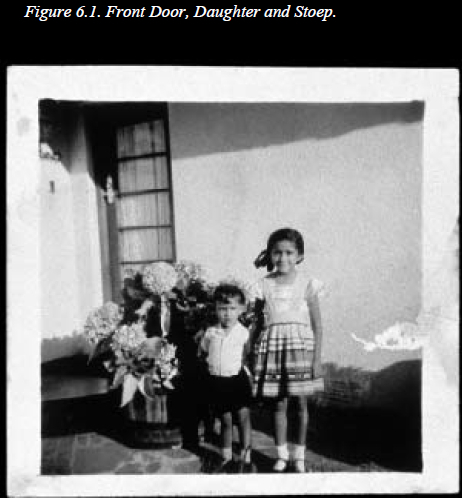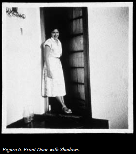 The last few photographs I want to consider are those of Mary Maurice. In Figure 6, she is photographed standing in the doorway of her home in Plumstead, before the family was evicted to Wynberg under the Group Areas Act. The caption beneath the photograph reads 'Front Door with Shadows' and takes us back to the "days when milk in glass bottles was delivered to your house".52 There are more photographs of this family, in the same setting, respectively captioned 'Front Door With Hydrangeas' and 'Front Door, Daughter and Stoep' (Figure 6.1). Father is nowhere to be seen in these 'Front Door' images, presumably he is the photographer.