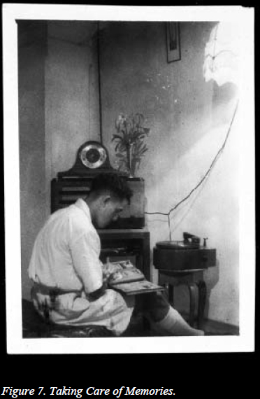 Figure 7 is captioned 'Taking Care of Memories' and the text notes that it was taken in 1916, Colombe, Ceylon. This photograph is mounted close to the end of the exhibition space. Taken in Ceylon, the young man pictured sent it to his family during his time away. The photograph reminds the viewer of the value of memories and photographs as memory. The Lives of Colour exhibition is not simply an exhibition of family photographs, the content of this family album as it is disclosed to inspection reveals a plurality of meanings. In this representation of coloured personal photographs, the more complicated arena of photographic representation and organised cultural evidence coincide to produce witnesses to a period in history inflected with repressive state politics, and enormous familial, social, cultural, and economic upheaval and dislocation.