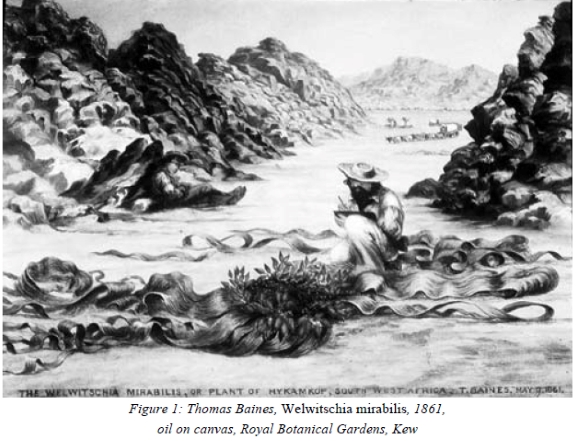 Chapman's reference to Sir William Hooker, the director of the Botanical Gardens at Kew, confirms that both painter and photographer were attempting to provide images for scientific purposes and Chapman did succeed in making several 'large trees' for botanical study.9 Early in the expedition, Baines and Chapman were drawn to record the botanical novelty, the Welwitschia mirabilis,10 and Baines's painting is still in the collection at Kew.