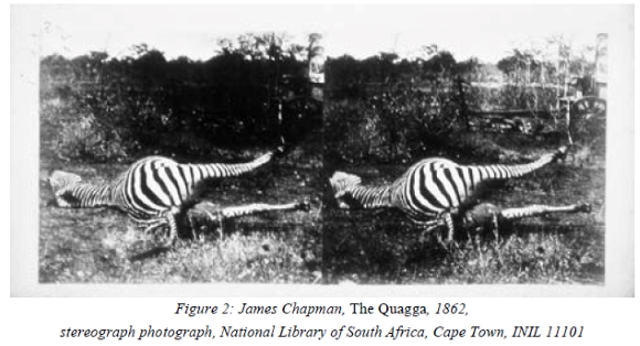 Chapman and Baines also made images for zoological purposes and Chapman actually intended to write a new zoology of Southern Africa. This fact explains his photograph of two rhinoceros heads that not only records the appearance of these animals but also invites comparison between two supposedly different species.11 Although, in the event, it was Baines who first published this comparison, the steel engraving that was made from his drawing clearly could not have the authority of the photograph. Similarly, only a photograph could substantiate Chapman's claim to have discovered a new species of quagga that had stripes all the way up its back legs - and, conversely, only knowledge of this claim could explain the extraordinary view taken in this photograph.