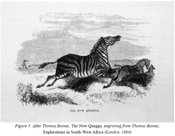 Although he does not acknowledge it, Baines seems to be referring to his practice of laying out carcases in the attitude of running which he then recorded in a drawing. Thus 'The new quagga', that was reproduced both as an engraving in the first edition of Chapman's Travels and in gilt embossing on the cover of his own Explorations, although apparently in motion, has clearly been viewed from below, as if the animal were stretched out on the ground in front of the artist.