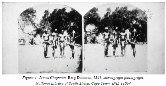 To the extent that Chapman and Baines in their verbal and visual accounts of their expedition invoked the dramatic themes of hunting, the progress of the expedition, and the advance of civilisation, amongst others, so it is clear that they were appealing to market as well as scientific interests. It is in these terms that certain of their more stereotyped images should be understood. For example, while both Chapman and Baines related certain of their work to the scientific principles of ethnology, they both also produced images of distinct, if contradictory prejudice. Thus both men created idealising images of warrior figures in the 'Noble Savage' tradition;29 and they both regularly referred sarcastically to local women as 'Namaqua Belle', for example, or 'Damara Ladies at their Toilette', etc.30 Needless to say, these prejudiced descriptions were exaggerated in the new captions provided by Joseph Kirkman when he offered the stereograph collection for sale as Pictures of African Travel in 1865. Thus Joseph Kirkman made his own contribution to the myth of the supposed fear of the camera amongst indigenous peoples by changing Chapman's caption of one photograph from 'Bushmen wondering what I am up to. Rietfontein September 1861' 31to 'Group of Bushwomen...taken almost instantaneously. Mark their fear and astonishment'. It is of course ironical that, in this context, the medium of photography was used to confirm the truth of these prejudices.