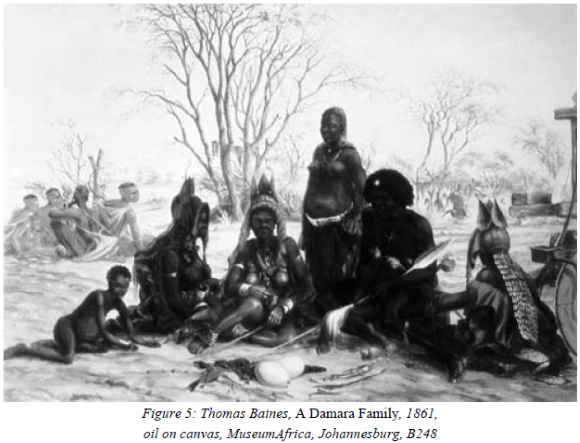 The photograph itself, moreover, shows the 'specimens' to have been posed in a series of different views from full-face to profile. Similarly, for 'the purposes of ethnology', as Livingstone had put it, Chapman's photograph of Bayeye huts has obviously been arranged to display harpoons, nets, spades and other forms of material culture.17 Baines's response to the new standard of accuracy that had been introduced by photography is articulated in connection with his painting of 'The Damara Family': in October 1861 Baines wrote that this work had taken him many months to complete, that he never worked at the principal figures of any painting without his model before him, and that he has supplied any defects only after consultation with Chapman and reference to his photographs in confirmation of his own recollections.18 Clearly, photography provided Baines with the model not only of exactness but also authenticity.