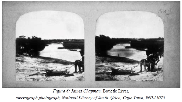 6 T.Baines, Explorations in South-West Africa (London, 1864), 148. In this extract and elsewhere in his journal, Baines refers to Chapman taking stereographic photographs, and this in fact is the only kind of photographic record that survives from the expedition. Yet, as Harold Carlsson pointed out in conversation, whenever Baines depicted Chapman photographing in a painting, he showed him not with the stereoscope but with the larger apparatus of the wet-plate collodion. In the later Shifts and Expedients of Camp Life, Baines again contrasted the 'exactitude of detail' that was possible in photography with its 'innumerable new and unexpected difficulties'. In his short notice of the medium Baines chose to refer to the Zambesi photographs of John Kirk that had recently been exhibited in London rather than the work of James Chapman. (T.Baines and W.B.Lord, Shifts and Expedients of Camp Life (London, 1871), 17).