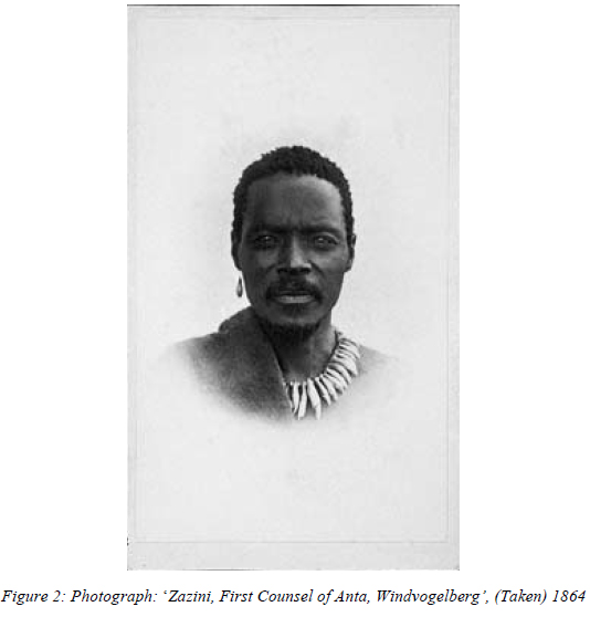 His portraits of the Xhosa chiefs are perhaps his best known photographs. His image of Maqoma appears on the cover and in the text of a recent edited collection on the history of Robben Island.27 A poor quality side profile view of Stokwe is reproduced in the body of the book and it was perhaps this photograph that Fritsch had in mind when he commented that 'some of the portraits left much to be desired'.28 Xoxo, Seyolo and Dilima were also photographed on this Robben Island trip, while two Xhosa chiefs and their first counsellors were photographed in hotels in small towns in the Eastern Cape: Hanta (Anta) and Sazini in Windvogelberg (modern Cathcart), and Sandile and Somi in Stutterheim.