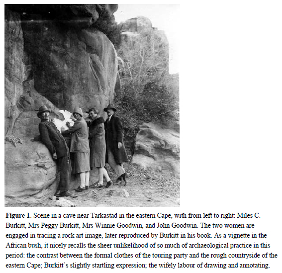 With Goodwin playing host, the two men and their wives embarked on a grand tour of southern African sites, on a route which saw them cover some 5,000 miles by road in the Union of South Africa. In Southern Rhodesia they were met by Neville Jones who acted as their guide for a further 1,500 miles, whereupon the Burkitts were despatched to van Riet Lowe for a final rounding-off in the Free State (500 miles). A number of photographs of the trip survive: the visiting party inspecting the ruins of Great Zimbabwe; a scene in which Goodwin has positioned his wife alongside a panel of rock art to give a sense of scale; and a scene in a cave near Tarkastad in the eastern Cape, with from left to right Miles Burkitt, Mrs Peggy Burkitt, Mrs Winnie Goodin, and John Goodwin.