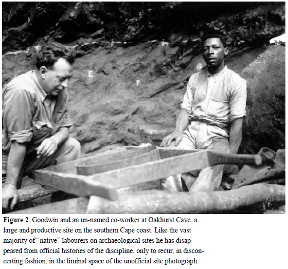 Like all such suppressions, in a colonial context this relation was more-or-less unstable, was liable to leakage, and where better to find traces of this than in the slippery domain of the visual image? A photograph from Goodwin's collection shows Goodwin and an un-named co-worker at Oakhurst Cave, a large and productive site in the southern Cape which was published in 1937.45