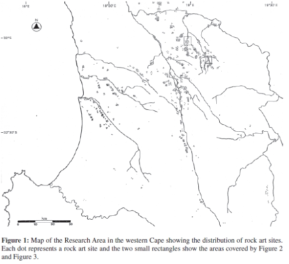 Although rock paintings occur in profusion throughout the landscape of the western Cape, the landscape itself is seldom depicted in the paintings. In this apparent contradiction we see the possibility of describing a relationship between pre-colonial artists and landscape in the western Cape. The observations we present refer to that part of the western Cape between the mouths of the Berg and Olifants Rivers and between the Atlantic coastline and the stone-scrub desert which forms the western margins of the Karoo. This is an area of some ten thousand square kilometres which we have been researching for more than two decades.