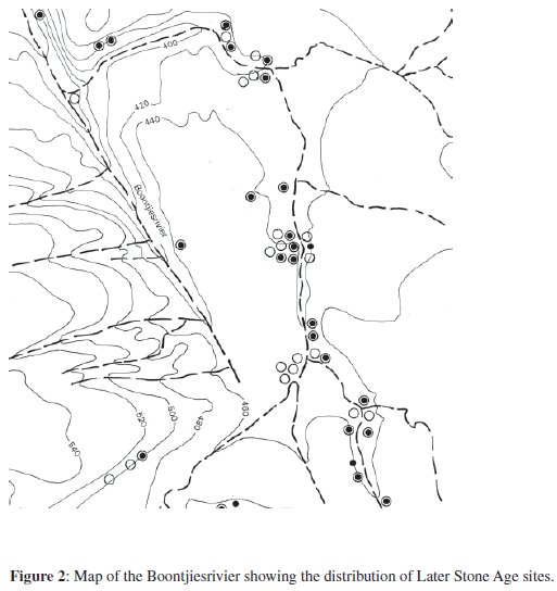 Taking Figure 2 as an example, out of a total of thirty occupation sites at Boontjiesrivier there are only three which do not have rock paintings. Two of these are stone tool scatters in open locations away from rocky outcrops and thus unsuitable as candidates for rock art. The remaining site is the only rock shelter location which has occupational debris but lacks rock art. In this instance, therefore, rock paintings are almost entirely restricted to domestic locations. A similar situation prevails in the second example at Watervalrivier shown in Figure 3.