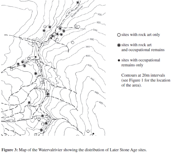 What is particularly noticeable in the surveys we have done is the fact that living sites are almost always painted and painted sites are almost always either sites where people lived or are very close to them. Figures 2 and 3 below are examples of two locations in the research area of the western Cape that have been thoroughly searched and recorded. The first thing one notices about these maps is that most of the sites are tightly clustered along river and stream courses and that very few sites are found at any great distance from water sources. For the purposes of this paper the sites have been divided into three categories: first, sites which have only rock paintings; second, sites which have rock paintings as well as substantial evidence of occupation; and third, sites which have occupational remains but no rock art. An occupation site is a place where people have lived over a sufficient time for deposit and artefacts to accrue. The deposit contains the accumulated refuse which may include faunal remains, plant food waste and grass bedding material. Artefacts consist of material manufactured or modified by the occupants such as stone tools, shards of pottery and wooden implements.
