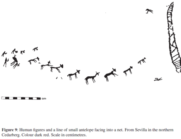 Of particular interest are those activities involving both humans and animals which are very rarely depicted in compositions. There are, for example, very few paintings of hunting episodes. The majority of depictions of bows in use are compositions involving human figures arranged so as to imply conflict between groups of men. Compositions that show men hunting eland with bows are extremely rare, though men, eland and bows are all very common. There are a number of paintings depicting the hunting of small bovids with nets, which do throw interesting light on the painting of landscape (Figure 9). These compositions include some human figures, often depicted funneling the animals, one or more nets, either with the upright support sticks or stick handles shown, and one or more small bovids 'moving toward' the net(s). Despite the fact that these activities must have had very specific locations in order to function effectively, no attempt is made to illustrate the context. As with the wooden pegs in the 'group scenes', the paintings end at the upright sticks and wooden handles, seemingly the interface here between the social, or technological, and the topographical. Whatever the purpose of the net paintings they needed no environmental or topographic context. They do add support to the interpretation of directionality offered earlier, because all but two of the twenty-four net scenes we know of have the net to the right. Once again movement, this time of the small antelope toward the net, is from left to right.