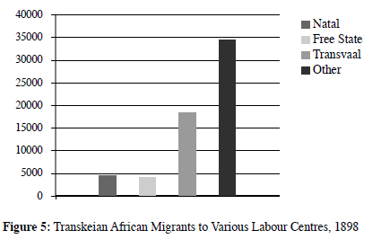 The reasons are not hard to find. Besides the appalling working conditions in the labour centres that had discouraged African labour migrancy before the rinderpest crisis, as we have seen, there was an urgent and immediate reason - the labour of Africans was needed in rebuilding the rural economy. Rather than rushing to distant labour centres as an alternative to farming, therefore, Africans tended to remain working within the homestead economy. Those who sold their labour did so with a specific target - to restock. Distant labour centres, especially the mines, were, therefore, less preferred to local or neighbourhood places of work. When Africans did venture long distances to seek work, it was for jobs sufficiently remunerative to outweigh the inconvenience. The figures for migrants leaving the Territories for various work centres in 1898 confirm this pattern. Most migrants went to work at labour centres where wages were higher than those on the Reef mines - to the docks in Cape Town, Port Elizabeth, East London and on public works within the Cape Colony. The following chart illustrates the pattern: