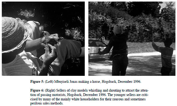 The other aspect of the relationship of the modellers to the market is that of their interaction with tourists. This is an area that has received some attention by historians recently.5 However, the Hogsback artists are in a different and arguably more complex relationship to the market for cultural artefacts than those who perform at the behest of cultural entrepreneurs of one sort or another at Shakaland or elsewhere, or those who create beadwork objects under the direct supervision and sometimes inspiration of middle-class white, or increasingly black, managers who interpret their vision of the market, or even impose it on those making the objects.6 The Hogsback artists are independent creators, conscious of the market and responding to it, but driven also by their own artistic vision. They work as individuals, sometimes side by side, but making and selling separately, with no intermediaries between themselves and the customers. They recognise and admire skilled individuals, and are easily able to identify which models have been produced by whom. They are not under the guidance of entrepreneurial or philanthropic systematisers of their art, and they are not conscious of any requirement for 'authenticity'.