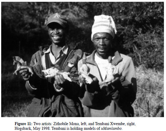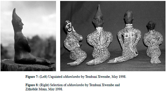 Much of this appears to mesh with the accounts of the artists. One modeler, Zithobile Mona, described an encounter with uMamlambo, or 'Mama River' as he calls her in English, while fishing. It seems he forgot to throw a stone into the river and say 'stay aside (kwelela) as is advisable. Luckily, he escaped the swelling and possible death that such an encounter often involves. It was this experience, he says, that led him to make these particular models.42 He sets his account in the context of the river-people, of whom his mermaid models represent one. She is white, he says, with long pitch-black hair.43 This figure appears to be an echo of the old fish-woman who inducts the amagqirha.