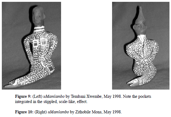 The ambivalent uMamlambo is one of the many Xhosa spirits and familiars. However, this pantheon is diverse, mutable and ambiguous, and may also, in the case of the clay mermaids, have incorporated elements from other cultures of the Eastern Cape. It would seem that the modelers have taken elements from two distinct aspects of the Xhosa cosmography, namely, on the one hand, the vindictive familiar uMamlambo, often taking the form of a beautiful woman, and on the other the elderly mermaid, one of the river people, abantu bamlambo, who plays a crucial role in the induction of the diviner, or healer, igqirha, into his or her craft.
