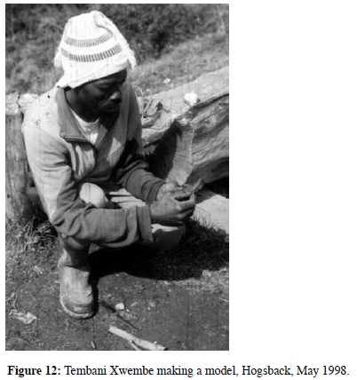 While they will happily produce to the specifications of a visitor, they also tend to have a strong sense of their own originality and of pride in their skill. One of the artists, Zithobile Mona says 'it's better to sell them what they're asking for.' Yet Tembani Xwembe adds that 'when you make these models, you make one because you see it was sold out. But sometimes when you take your clay, some new idea will simply come up, and then you'll do it.' They operate within a shared artistic and social world, yet create objects that are distinctively individual. They are unaware of discourses that draw a distinction between creative art and the making of tourist curios, yet are in no doubt as to the individuality and creativity of each artist: 'the hands of the people are not the same (izandla zomntu azifanï)! Tembani Xwembe elaborates: 'I make what I think I want to do - I think of nothing else until I have completed what I'm doing - and nobody else can think what you're thinking.'7