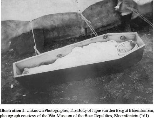 As a cosmopolitan Liberal, Hobhouse seems not to have entirely approved of the mortuary practices she was witnessing.9 But the preparation of the dead for burial, and the photographic recording of the prepared body - finally to 'secure the shadow ere the substance fade' - had been widespread in the photographic world in the second half of the nineteenth century.10 The photographs that Hobhouse saw being taken in Kimberley are not known to have survived. Her comments on this occasion could apply also to several of the photographs preserved in Bloemfontein and published in Suffering of War (Illustration 1). Significantly, when the Commission of Ladies that was appointed by the War Office to check on Hobhouse's findings visited Bloemfontein in September 1901, they referred to 'photographs shown by women in camp of their dead children' to confirm that corpses were being 'properly shrouded and coffined'.11