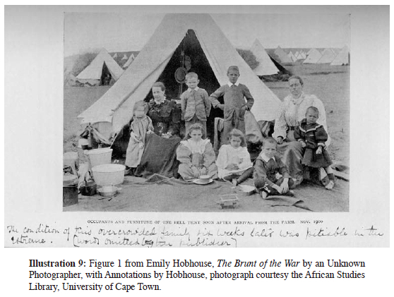 9 But she did at least understand them. In October 1901 the Australian news reporter Mrs Dickenson visited the 'so-called Refugee Camp' at Merebank with Mrs Erasmus, a camp organizer, and wrote: 'One pale, haggard woman sat at the entrance of her bell-tent, holding a child just at its last gasp, and wanted her photographed; but I told Mrs Erasmus to explain how sorry I felt for her, but that the photograph would have been such a painful one for her she would never have liked to look at it.' (Emily Hobhouse, The Brunt of the War and Where it Fell (London: Methuen, 1902, 204)). I am grateful to Elizabeth van Heyningen for this reference.