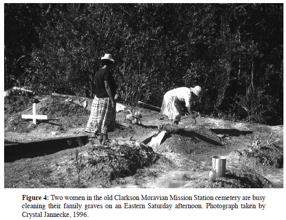 The Moravian mission at Clarkson began in 1839 and was established in response to requests by British colonial authorities for Moravian missionaries to work among the 'coloured' people, which in the Cape colonial context of the 1830s included those classified as 'Fingo/Mfengu', freed slaves, as well as designated groups of people now referred to as Khoikhoi or Khoisan. The South African Apartheid State officially classified the Clarkson mission community as 'coloured' during the 1950s. An emerging commonly taken-for-granted perception of this official racial category of people was that they had no significant long-standing history. By implication then, the Clarksoners were commonly regarded as having no historical connection to the mission land used and occupied, despite having rights in land that dated back to the establishment of the mission station in 1839. By the 1990s the Clarkson Moravian mission community had appropriated both a racialised 'coloured' and a Moravian mission identity. The community firmly followed a church calendar that annually commemorated the Unitas Fratum, and Herrnhuters with Zinzendorf as its leader. It also celebrated the establishment of the Moravian mission in South Africa by George Schmidt as well as the beginning of the Clarkson mission in the Tsitsikamma. The most noteworthy memorialized event of the Church calendar remains the Festival of 'Brotherly Love' (August 13), which marked the Herrnhuters' acceptance of a village constitution and 'Brotherly Union Compact'.34 A week later children honoured a children's festival of Christian awakening and conversion.35 A prescribed Moravian liturgy with accompanying rituals annually observes Lent and Easter. These rituals show the appropriation and reordering of elements of the Moravian missionary traditions, customs, rules and practices. Elements of remembered practices that fell outside of these Moravian conventions had been included, like the annual grave-cleaning and funeral rituals bringing to the fore customs, traditions, rules and regulations unique to Clarkson. From these emerged a Moravian mission identity tied to the place and territorial boundaries of Clarkson. The people living there had cultivated deep associations with each other over time and to the land occupied since 1839.