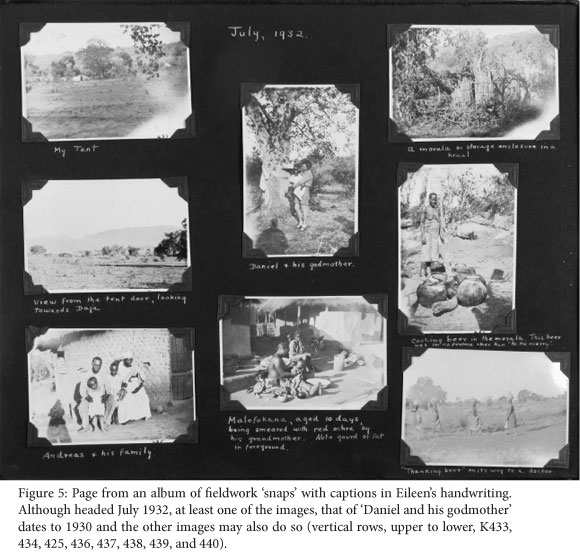 The photograph captioned Andreas and his family' on the lower left of the page also includes the shadow of the photographer but in this case it is almost certainly Eileen's shadow. The two photographs above this are captioned 'My tent' and 'View from the tent door, looking towards Daja'. Here again there is uncertainty about the date as in 1932 Eileen camped on her own in a low-lying area of the Molototse valley some distance from the Daja forest. Nonetheless, these photographs show that the ethnographers were living among the Lobedu people, they were in situ, so to speak, unlike on Eileen's previous visit when she stayed in the comfort of the mission station. Although not intended for publication, the caption 'View from the tent door ...' brings to mind the quintessential fieldwork image of Malinowski's tent on a Trobriand beach, and the more recent discourse on fieldwork and 'writing culture'.27
