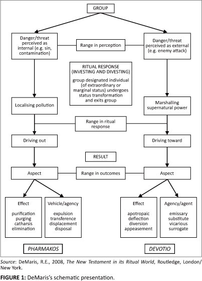 Until now different scholars have treated the martyrs in 2 Maccabees in different ways. Most commentaries merely record the martyr narratives in 2 Maccabees 6 and 7, without providing much more than a surface reading. Moffat (in Charles 1913:125-154), as well as Kamphausen (1921,) are both good examples of this approach in that they say quite a lot about the different text variations and codices of 2 Maccabees 6 and 7, but never ask questions such as 'what did these stories actually mean to a certain religious community' and 'why were the narratives recorded and presented in a specific way'? Thus little has been proffered with regard to these respective texts' deeper significances and meanings for the very communities that produced them. Jonathan Goldstein (1983:316) for example, deals in his commentary on 2 Maccabees extensively with the martyrs in Chapters 6 and 7, but does not investigate any ideas of atonement, cleansing or even catharsis implied by their stories. The underlying metaphor of sacrifice and its function goes unrecognised. The same is true of the various introductions to the Apocrypha given by many acknowledged scholars. Erich S. Gruen (1998, 2002:275), for example, touches on various motives such as propaganda and humour, but does not proffer a connection between the martyrs and the concept of sacrifice. Again, David A. deSilva only hints at the possibility that the martyrs' death might have some atoning effect, but does not suggest a scheme as to how this atonement works. George W.E. Nickelsburg (2005:108-110) raises an expectation with his statement that '2 Maccabees is a refreshing example of a text that muddies the waters and breaks the stereotypes', and elaborates on the idea of resurrection, but nevertheless says nothing about the sacrificial nature of the martyrs in 2 Maccabees 6 and 7. Indeed, as was intimated earlier, Jan Willem van Henten (1997) was the first and only scholar to bring the idea of the martyrs' atoning death in 2 Maccabees to the fore. One of his main arguments for his point of view is based on the use of the Greek verb καταλλάσσω [reconcile] in 2 Maccabees 7:33 (Van Henten 2004:156, 160). He argues that the idea of atonement by death is not completely foreign to second temple Judaism, and uses texts such as the last song of the suffering servant in Deutero-Isaiah (Is 52:13-53:12) as proof for his view. After Van Henten, Daniel R. Schwartz (2008), in his commentary on 2 Maccabees, follows Van Henten's approach of ten years earlier. Both of these scholars argue quite convincingly from various texts in the Old Testament that the idea of sacrificial atonement was not unusual to Judaism and that it also had a firm grounding in Greek culture. Schwartz (2008:299) states in this regard that 'the present chapter emphasizes repeatedly that the death of martyrs causes God to become reconciled with his servants'. The problem is that neither Van Henten nor Schwartz engaged with the already well-developed area of ritual critique. Ritual critique would be appropriate to investigate the martyr texts of 2 Maccabees 6 and 7, because all relevant elements of a ritual are present, namely sacrifice, atonement and catharsis.