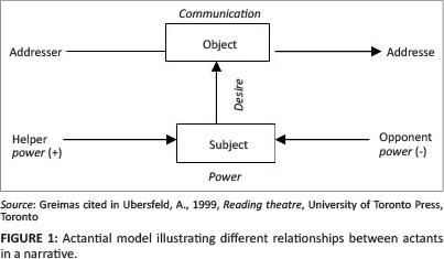 The actantial model is the best known and the most quoted element of Greimas's theory (Czamiauska-Joerges & Gagliardi 2003:41). The main role of the actantial model is to reveal different functions of actants in a narrative (Neemann 1999:126). According to Tesnière (cf. Greimas & Courtés 1979:3), an actant is what produces or undergoes an action and is different from a character. Characters belong to the figurative level (which will not be dealt with here) whilst actants belong to the narrative analysis. An actant can be a human being, an abstraction, a collective character or an animal (Greimas 1976:96). A character can assume different actantial functions. An actant is an antactant when his action is opposing the action of another actant. Greimas's actantial model consists of six actants, namely: the subject, the object, the addresser (sender), the addressee (receiver), the helper and the opponent (Ubersfeld 1999:37-40). The Greimassian actantial model is now considered.