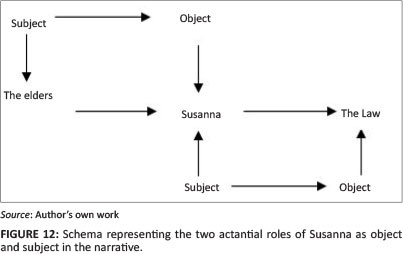 Moreover, being subject or object does not exclude one or the other. An actant can assume different actantial functions in a narrative (cf. Vance 1989:103). In Susanna, for example, the elders are dual subjects (from the Babylonian perspective) but they are also opponents. God is the addresser but he is also Susanna's helper (Kanonge 2010:135-137). Susanna and the elders are subjects in the narrative with different objects. The elders are anti-subject to Susanna (opposing her quest, her chastity) and Susanna is anti-subject to the elders (opposing their sexual perversion). Finally and most importantly, the subject of a narrative must be the actant in pursuit of the main object of the story. In the story of Susanna, the main object is the maintenance of the Law. Therefore, Susanna is the subject and the two elders are anti-subjects as they oppose the object of the story.