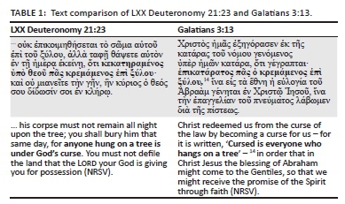 Paul wrote his letter to the Galatians either between 50-52 CE during his stay in Corinth (if the southern Galatian theory is accepted), or during 52-55 CE from Ephesus (if the northern Galatian theory is accepted) (cf. Du Toit 1984:35; Kümmel 1975:304; Schnelle 1996:118) - the more generally accepted theory. He quotes explicitly from six texts within the short space of Galatians 3:1-14, of which five are from the Torah (Gn 15:6; 12:3; Dt 27:26; Lv 18:5; and Dt 21:23) and one from the prophet Habakkuk (2:4).8 The quotation from Deuteronomy 21:23 in Galatians 3:13 is the last of the six in the list (Table 1).