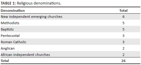 The data was collected using a semi-structured questionnaire with four questions focusing on the use of technology in the church. The questions elicited information on the extent of technology use, factors influencing use, opportunities resulting from the use of technology, and weaknesses of technology use. A purposive sample of 26 pastors in two cities (Mutare and Harare) were interviewed. The interviews were conducted by the present researcher. The pastors were drawn from the religious denominations seen in Table 1.