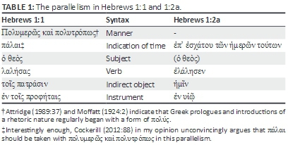 The only element in 1:1 which does not have a parallel in 1:2a is the phrase πολυμερῶςκαὶπολυτρόπως, which refers to God's Old Testament revelation which he gave in various parts and in various ways. But, although 1:2a does not state that God's revelation in his Son came once only (ἅπαξ/ἐφάπαξ),15 it is implied in a sense (cf. Lewicki 2004:16). Moreover, the absence of a parallel for πολυμερῶςκαὶπολυτρόπως in this parallelism virtually emphasises the uniqueness and superiority of God's revelation in his Son by way of an aposiopesis (cf. Wider 1997:14).
