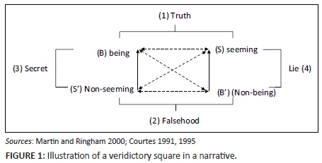 It must be noted that the overall focus of the thematic analysis is broader than what this article aims to achieve. Therefore, as indicated above, only the semiotic square of veridiction (also known as a veridictory square) will be of significant importance here. According to Martin and Ringham (2000:12), the semiotic square of veridiction is a visual presentation of the elementary structure of meaning. It articulates the relationships of opposition, contradiction and implication in the story.