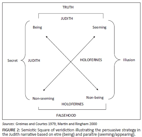 The findings as mapped out in the semiotic square of veridiction shows that Judith contains, in its many scenes, veridictory modalities: être and paraître (being and seeming/ appearing).