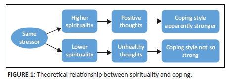 The theoretical relationship between spirituality and coping in the workplace has been explored and is depicted in Figure 1. Trends in the literature indicate the influence of spirituality on coping (Gnanaprakash 2013:383; Krok 2008:643) and that people may respond differently given the same challenges (Louw & Viviers 2010:1). The same stressor may be posed to different people. Yet, higher and lower levels of spirituality result in the application of positive and negative thoughts, respectively. Therefore, according to Rowe and Allen (2003:63) and Bryant-Davis et al. (2012), positive thoughts are associated with high spirituality and appear to result in stronger coping styles, while the application of negative thoughts is associated with lower spirituality, resulting in weak coping styles.