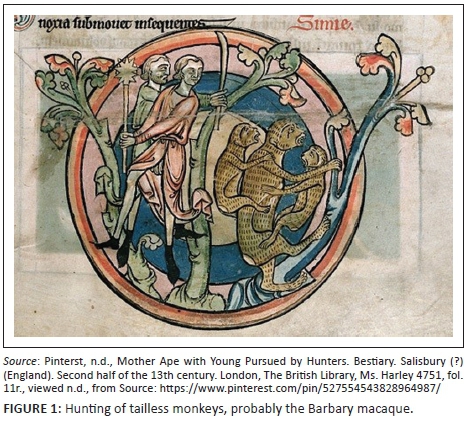 European sources from the 11th and 12th centuries to the 15th century mention the practice of keeping monkeys (in general) as customary in various countries, such as France, Italy and Germany (Buquet 2013; Paden William 2016:34; Wich & Marshall 2016:133, see also Figure 3). Archaeological evidence of the remains of Barbary macaques from the classical period and the Middle Ages was found throughout England as well (Lynn 1997; Walker-Meikle 2012:31). This indicates that monkeys that arrived in Europe were transported to distant regions in the south and centre of the continent.