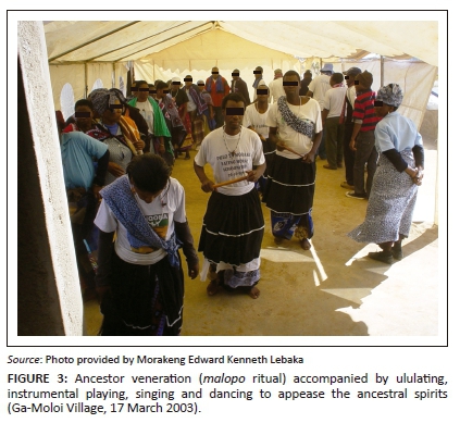 The above information correlates with the observation of Mamagabe Michael Tjabadi,7 a traditional healer (pers. comm., 16 June 2006), namely that 'in Bapedi culture, gatherings of communal ancestor veneration are usually accompanied by ululating, instrumental playing, singing and dancing' (see Figure 3). Mamagabe intimates that, 'for Bapedi, malopo songs are both an expression and a contribution to Bapedi religious ritual experience within this specific cultural group'.