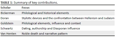 Despite the intricacies which, together, reveal the makeup of the text's narrative aim and communicative strategy, key contributions seem to focus on approaches which deal with the clarification of ideas rather than the reason for their presence and the persuasion to adopt them. To clarify, there is a focus on philology, style, dating and pattern, but a lack of focus on the strategy persuaded the reader towards adopting certain innovative ideas. Elias Bickerman (1979:11-17), for example, searched for an intimate understanding of the parties involved. He provides a solid base for further analysis of the first two books of Maccabees. The chronology, order and detail of events are a priority, resulting in an investigation into historical, philological and compositional elements. In terms of focus, Jonathan Goldstein (1983:8) is not dissimilar, with the exception of discussing the text's incorporation of the Torah and the prophets. Goldstein, in the rest of his book, sets out to explain the Hellenistic and Jewish influential power play. Closer to the goals of this paper lies Robert Doran (2012:15) with his inclination towards metaphors, worldview, larger narrative units and wordplay which results in a stronger exposition of rhetorical elements. Essential to Schwartz's analysis (2008:15) is the precise demarcation of the text as a second century BCE Jewish writing, which binds the interpretation to an account of Jerusalem-centred events specifically centred round the Maccabean revolt (167-160 BCE). The analysis thus flows from the historical setting of this document. Furthermore, Schwartz (2008:525-527) shares vital insights on composition and argues that the authors of the first prefixed letter took notice of the narrative. For Jan Willem van Henten (1997:295), the text is centred round a pattern of six key elements which unfolds to explicate the political, religious and philosophical communication. Martyrdom is the focus. And this analysis shows a text that portrays the martyrs as heroes of the Jewish people.