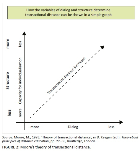 Figure 2 provides a measurement of the effects of dialogue and structure in the educational process. It illustrates that as one increases, so the other decreases. Therefore, a more structured course requires less dialogue and, conversely, the more the dialogue, the less the required structure of the course. Moore and Kearsley (1996) states that it is the physical distance that determines the communication gap, which can lead to misunderstandings between the learner and the teacher.