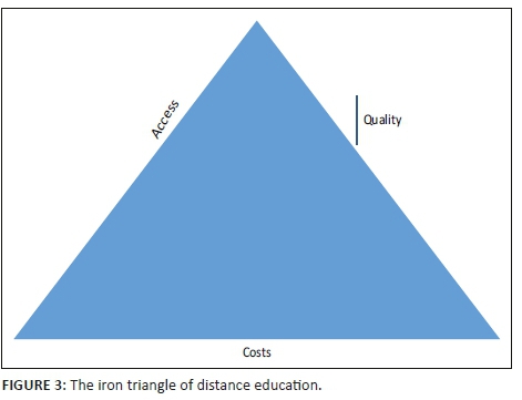 The 'Iron Triangle', as put forward by Daniel (2013), addresses the economics of DE and, in particular, the relationships between access, quality and costs. Daniel and Uvalic-Trumbic (2013) suggest that to address an increasing number of students, without compromising outcomes and growing costs, the use of technology needs to be heightened.