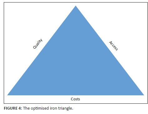 The iron triangle links the notions of access, quality and costs. Lane (2014) posits that the use of technology in DE presents the possibility of widening access to HE, while at the same time lowering the costs without compromising the outcomes. Figure 3 shows the basic triangle, as presented by Daniel (2013), with the three factors all being of equal length. The assumption is that as one of the sides of the triangle increases, so the others will diminish. Taking into account scalability, there is little room to increase student numbers without incurring additional costs. Daniel and Uvalic-Trumbic (2013) assert that e-learning, because it is not constrained by physical limitations, is able to change the triangle and can provide quality education for a far greater number of students and, at the same time, reduce the associated costs. This triangle can then be optimised, as shown in Figure 4.