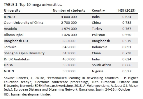 Other DE theorists have discussed structural and institutional aspects of D.E. Peters (1983) expanded the above theories and definitions to include an element of industrialisation, particularly in the production of high-quality teaching materials for teaching a large number of students. His conceptualisation of DE as a form of massification of the education system forms the basis of the model used in many large DE institutions still today, particularly in developing countries. According to Daniel (1996), a DE university with a student population of over 100 000 at degree level can be referred to as a mega university. Table 1 shows a summary of the top 10 mega universities in the world.