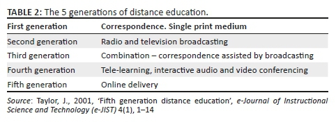 Distance education can therefore be seen as an educational process whereby the learner and the teacher are separated not only geographically, but also cognitively. Various technologies are used to provide the tools to narrow this distance. Historically, teaching took place using paper and pen - the correspondence mode. The first DE teaching university was opened in 1946 in South Africa - the University of South Africa (Unisa) and today still functions primarily as a correspondence-based university. Taylor (2001) presented the use of different media in DE through what he termed the '5 generations' of DE.
