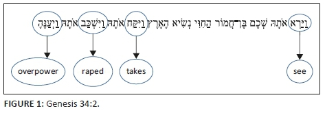 In this study, however, I consider Genesis 34 and 2 Samuel 13 to be stories of the striking of a woman through rape. In the Genesis 34 story, Dinah is the female figure at the centre of the story; it is she who experiences sexual violence, and it is this experience in her life around which everything else revolves. Genesis 34:2 highlights the progression through the combination of verbs used (see Figure 1).