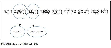 The climactic moment in this verse happens when Shechem 'raped' (שׁכב)6 her (Dinah) and 'overpowering her' (ענה). The verb שׁכב is used in several instances for a sexual encounter between male and female (Gn 30:16, 35:22; 2 Sm 11:4; 13:14). Worthy for us to note is that the combination of these two verbs is also used to describe the sexual encounter between Amnon and Tamar, albeit in reverse, in 2 Samuel 13:14 (see Figure 2).
