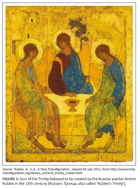 In Andrei Rublev's icon (see Figure 1), the persons of the Holy Trinity are shown in the order in which they are confessed in the Credo.8 Even before the time of Rublev, the depictions of the Genesis 18 scenes were formally angelological from the beginning (Bunge 2007:51-54).9 The visitors in the narrative of Genesis 18 were understood as divine messengers or angels. Around 1500 gestures and postures of these three angels (completely identical) were used to describe the doctrine of the inter-Trinitarian relationship. The emphasis was on divine essence within the confessional truth of Trinity.