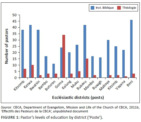 During the Bible study session at the Goma-Ville parish on the 20th of July 2012, the talk with the former President and Legal representative of the CBCA revealed that: '[T]heologians are very selective in terms of the geographic areas of service and always decline the appointments of the church when it comes to the rural areas' (Kighoma 2012). This situation is very risky for the future of the church in the rural areas. It is true that the availability of those called 'Biblistes' in the rural areas in today's context is a proof of their commitment. However, these pastors still are limited in numbers and to leave them at the frontline where a sound doctrine is needed to be taught is a dangerous decision for the church. In addition, to have 67.3% of all theologians in the cities is a waste of resources. The idea of continuing theological education or refresher courses for pastors is part of the solution.