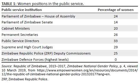 The Zimbabwean Constitution clearly provides for the assurance and protection of equality regardless of gender. The Zimbabwe National Gender Policy (ZNGP) 2013-2017 (Republic of Zimbabwe 2013-2017) has its vision clearly stated as, 'A gender just society in which men and women enjoy equality, contribute and benefit as equal partners in the development of the country'. The goal is also unequivocally stated as, 'To eradicate gender discrimination and inequalities in all spheres of life and development' (Republic of Zimbabwe 2013-2017:11). With this in mind, the nation is making efforts to have 50:50 representation and participation in public spheres. The representation of women in leadership positions at various levels in public service calls for greater attention and need for improvement (UNDP 2017). The Republic of Zimbabwe (2013-2017:4) adds that, 'the reality however still falls short of the target as there still exist disparities in a number of areas'. The disparity on gender inequality still favours more men than women as can be seen in Table 1 (Republic of Zimbabwe 2013-2017:4).